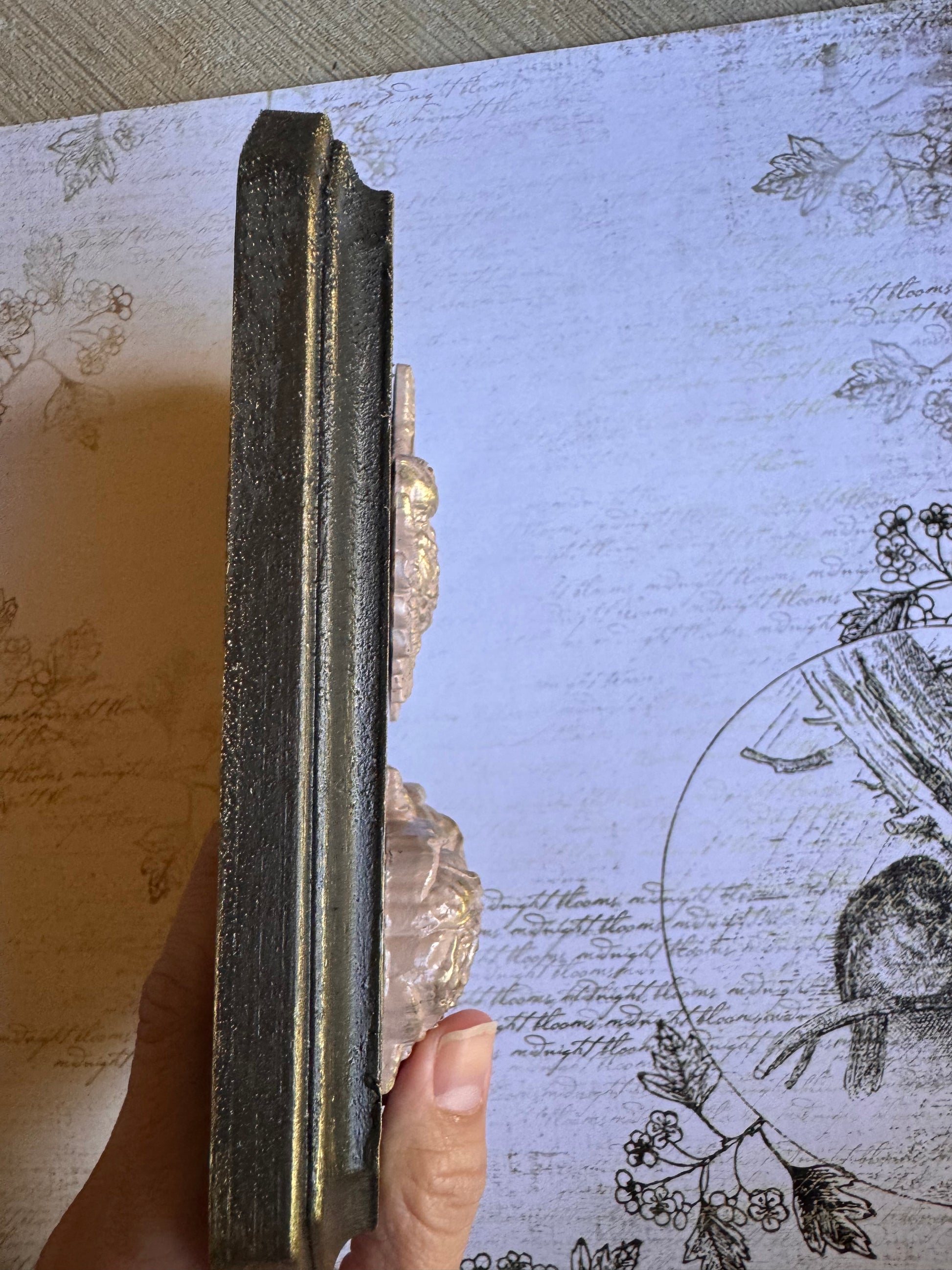 Unique french country plaque, handcrafted, perfect for maximalism and collage wall decor. This has rustic dark brown base, white vintage style script, and dusty pink/gold accents. It has a gloss finish.