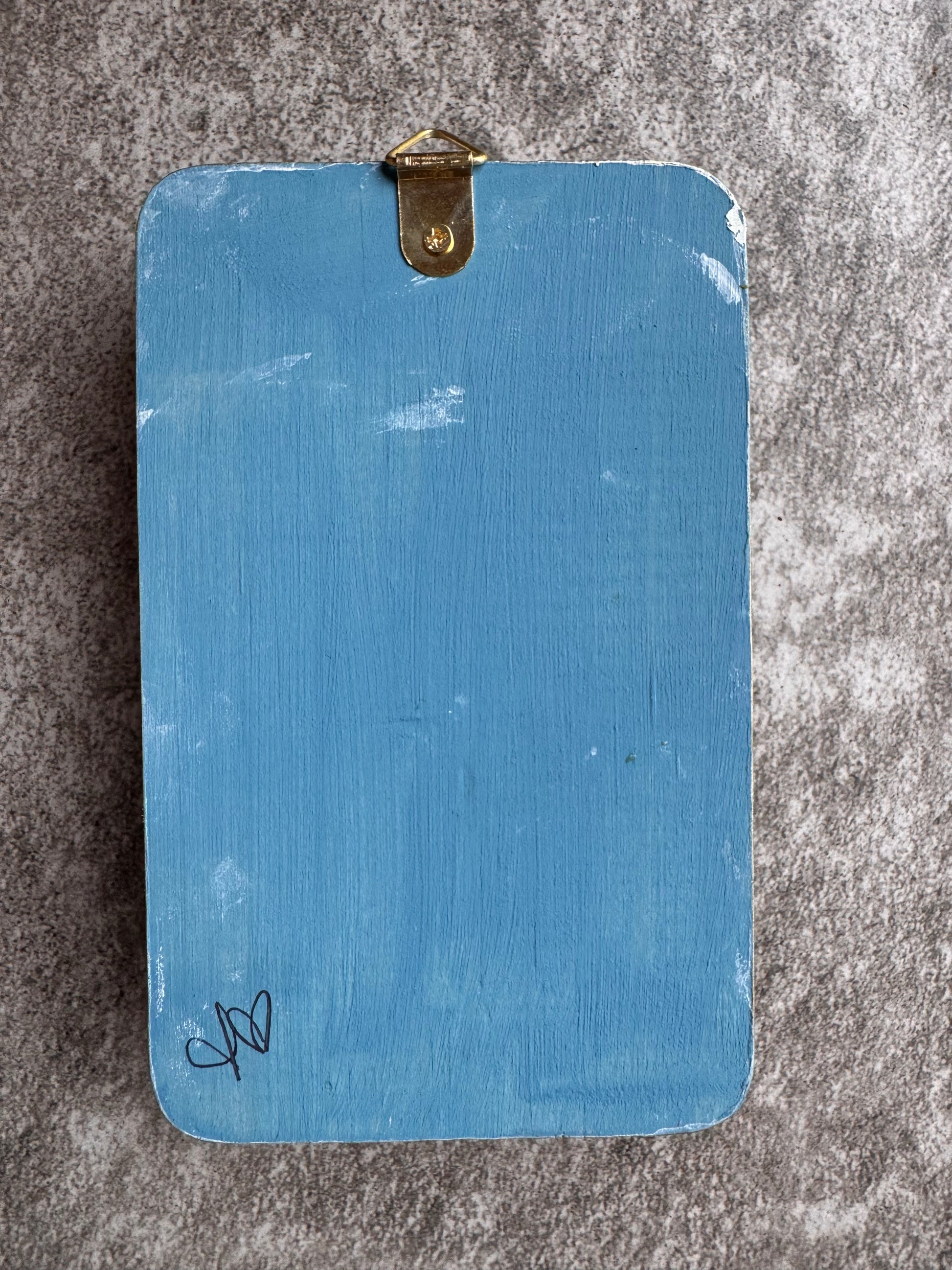 This gorgeous composition was handcrafted on a wooden plaque from clay. Hand-painted with gorgeous tones of blues and browns. This relief makes a great unique addition to a gallery wall, or simply add it to small easel as table decor.